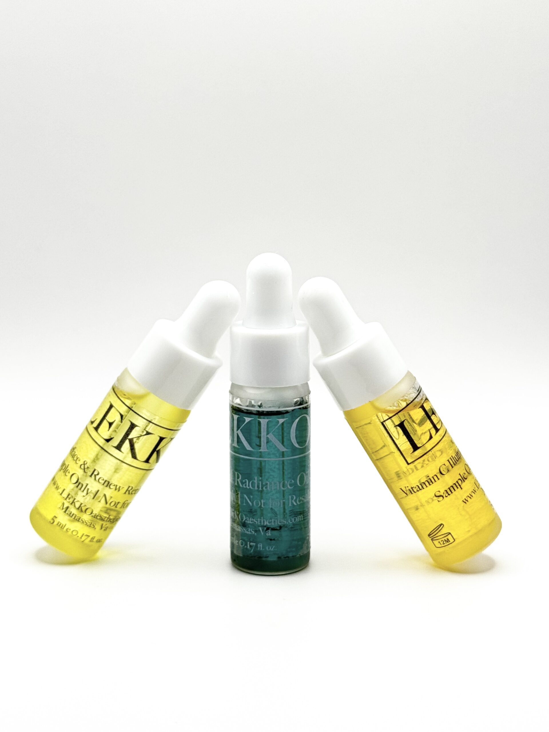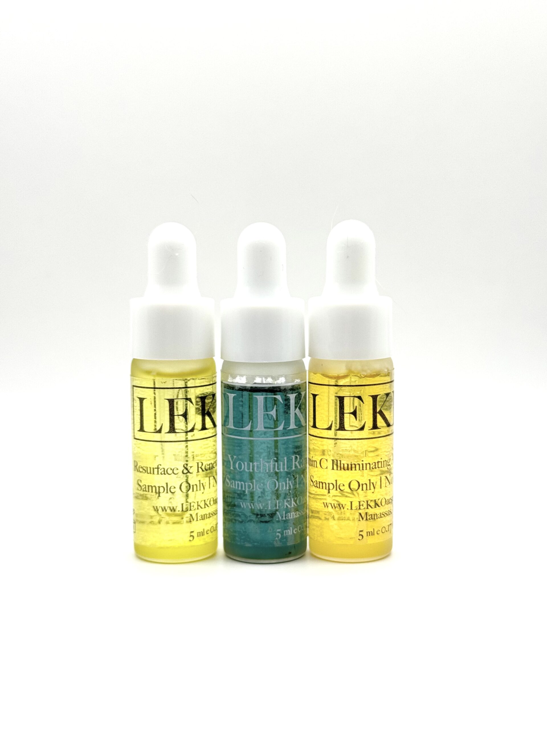 Discover our best sellers with our 3 piece sample set. Best for trial and travel. Receive a glass 5 ml vial with dropper of each of the following: