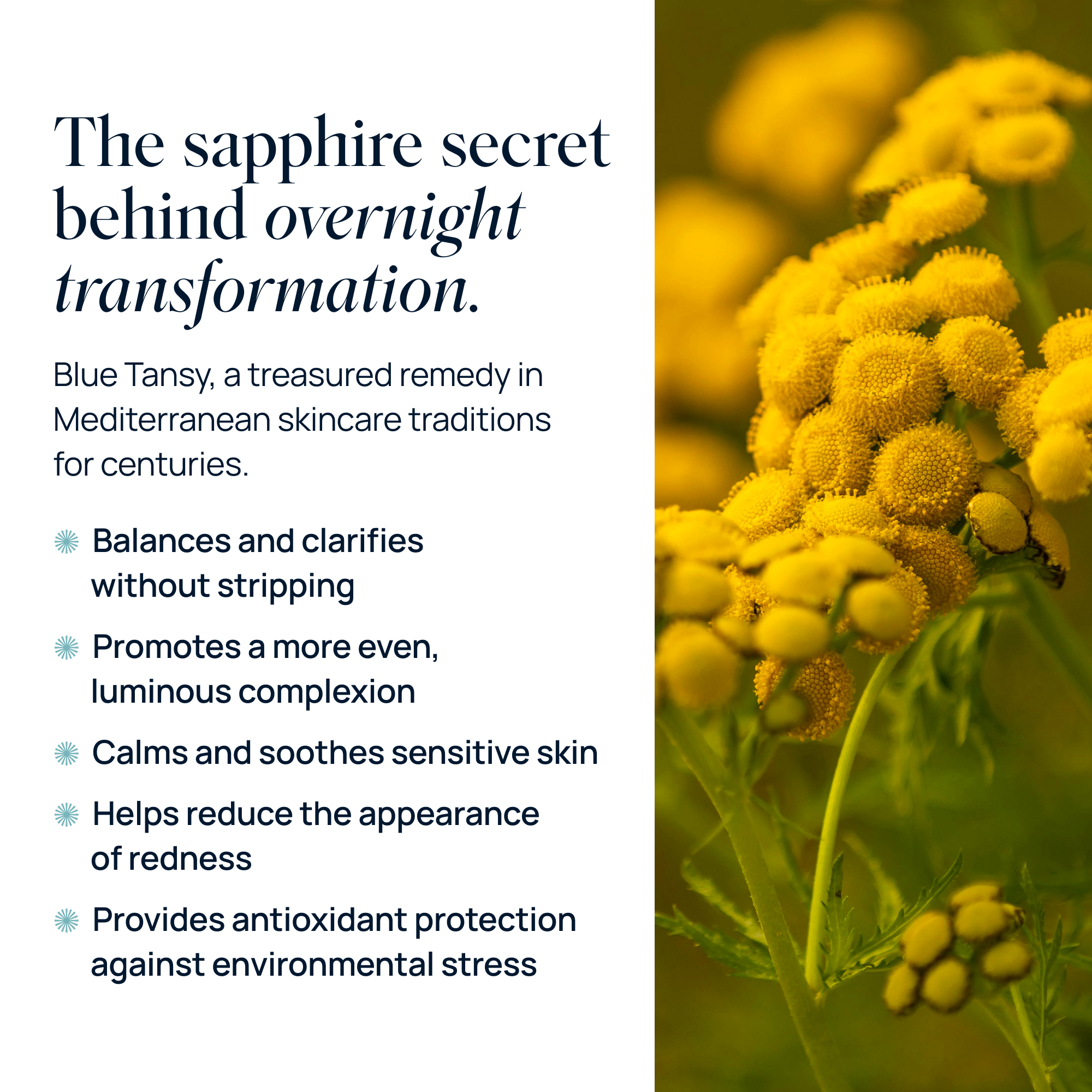 The sapphire secret behind overnight transformation. This precious extract has been treasured in Mediterranean skincare traditions for centuries thanks to its ability to soothe reactive skin, reduce visible redness, and restore balance to stressed complexions.
